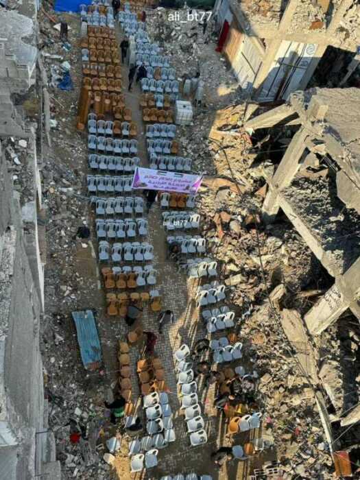 1er mars 2025 : au milieu des décombres, les préparatifs sont en cours pour le plus grand Iftar de la bande de Gaza, qui se tiendra derrière l’hôpital Kamal Adwan, au nord de Gaza, assiégé par Israël pendant des mois. (photo Al-Jarmaq News)