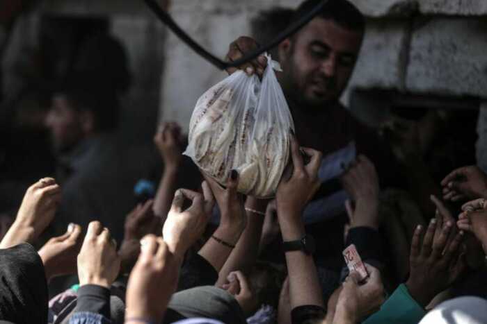 Les Palestiniens attendent dans de longues files d’attente pour acheter du pain devant la seule boulangerie de la ville (Khan Younis) en raison de la décision israélienne d’autoriser une quantité limitée de farine et de carburant à entrer dans Gaza. (Photo par Ali Jadallah/Anadolu via Getty Images)