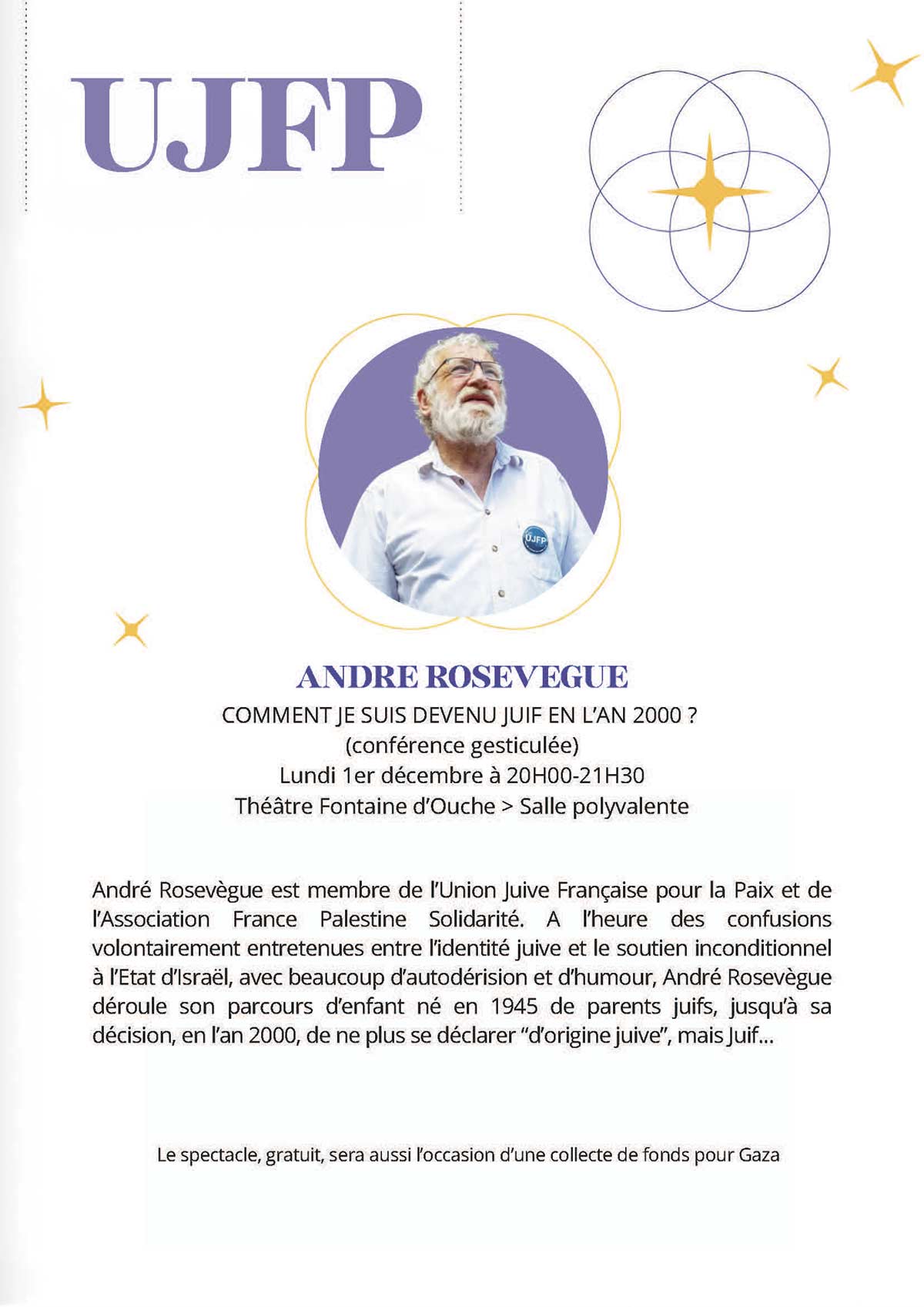 André Rosevègue est membre de l’Union Juive Française pour la Paix et de l’Association France Palestine Solidarité. À l’heure des confusions volontairement entretenues entre l’identité juive et le soutien inconditionnel à l’État d’Israël, avec beaucoup d’autodérision et d’humour, André Rosevègue déroule son parcours d’enfant né en 1945 de parents juifs, jusqu’à sa décision, en l’an 2000, de ne plus se déclarer « d’origine juive », mais Juif…