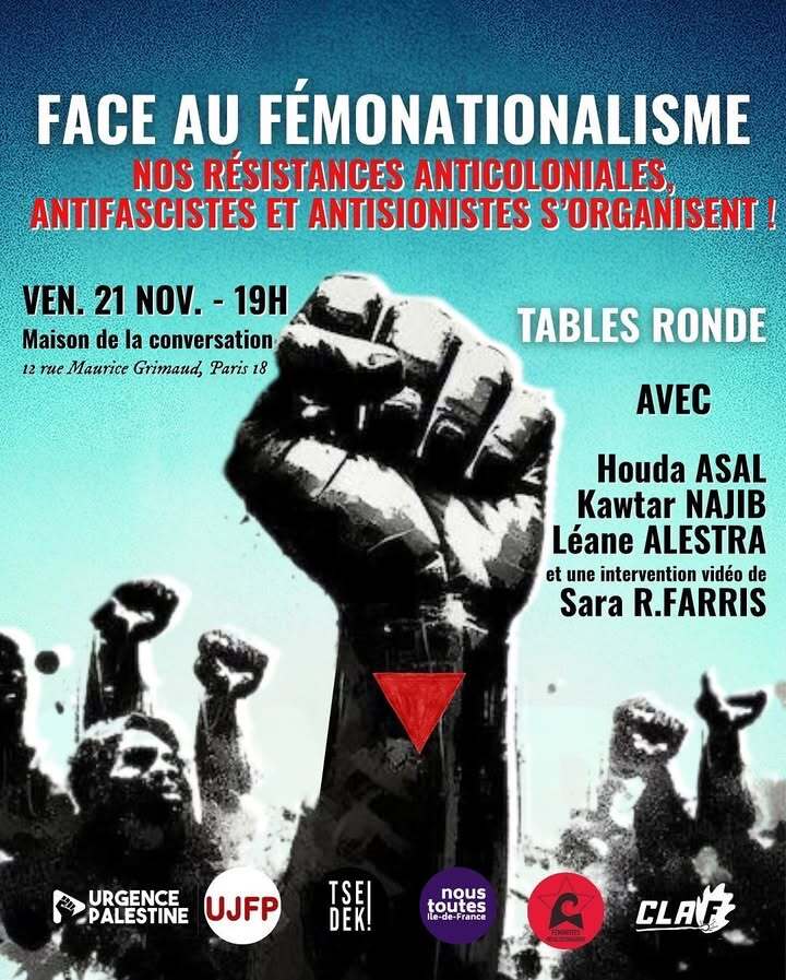 🚩 Table ronde en présence d’Houda Asal, Kawtar Najib et Léane Alestra pour échanger sur le fémonationalisme, l’islamophobie, le racisme anti-palestinien et nos résistances anticoloniales, antifascistes et antisionistes !