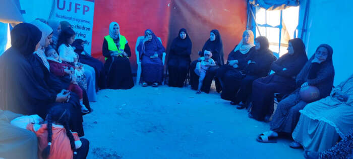 Poursuite du soutien psychologique pour les femmes déplacées dans le camp d’Al-Istiqlal, situé dans le gouvernorat de Deir al-Balah